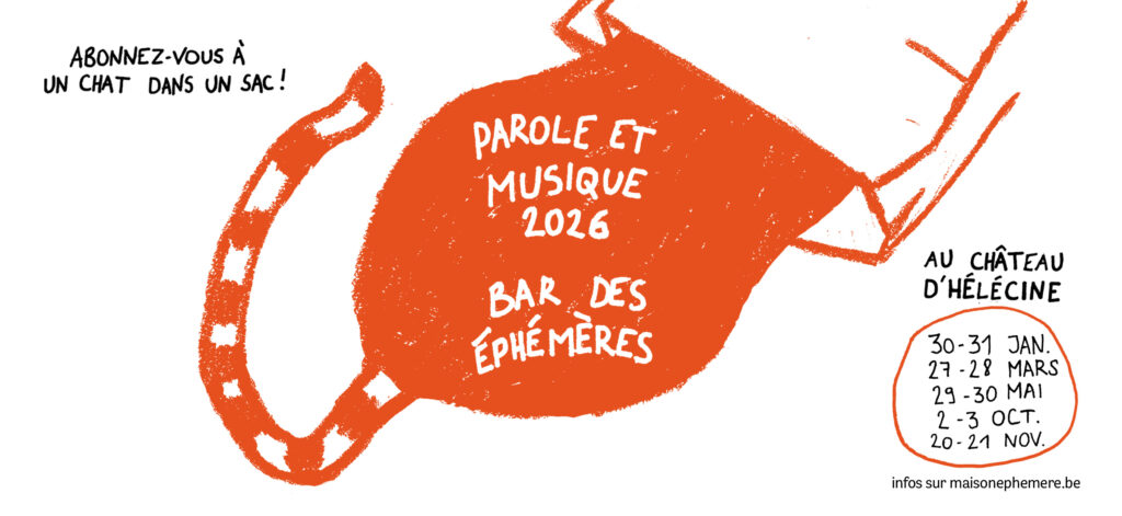 C’est désormais acquis : chaque année nous vous proposons des formules d’abonnement pour notre programmation au Bar des Éphémères (Château d’Hélécine) : 3 à 5 weekends par an, découvrez une sélection de textes et un univers musical, interprétés par des artistes… autour d’un verre, d’un repas à l’envie ! Avec vos ami.e.s, votre famille, votre amoureuse, votre compagnon…